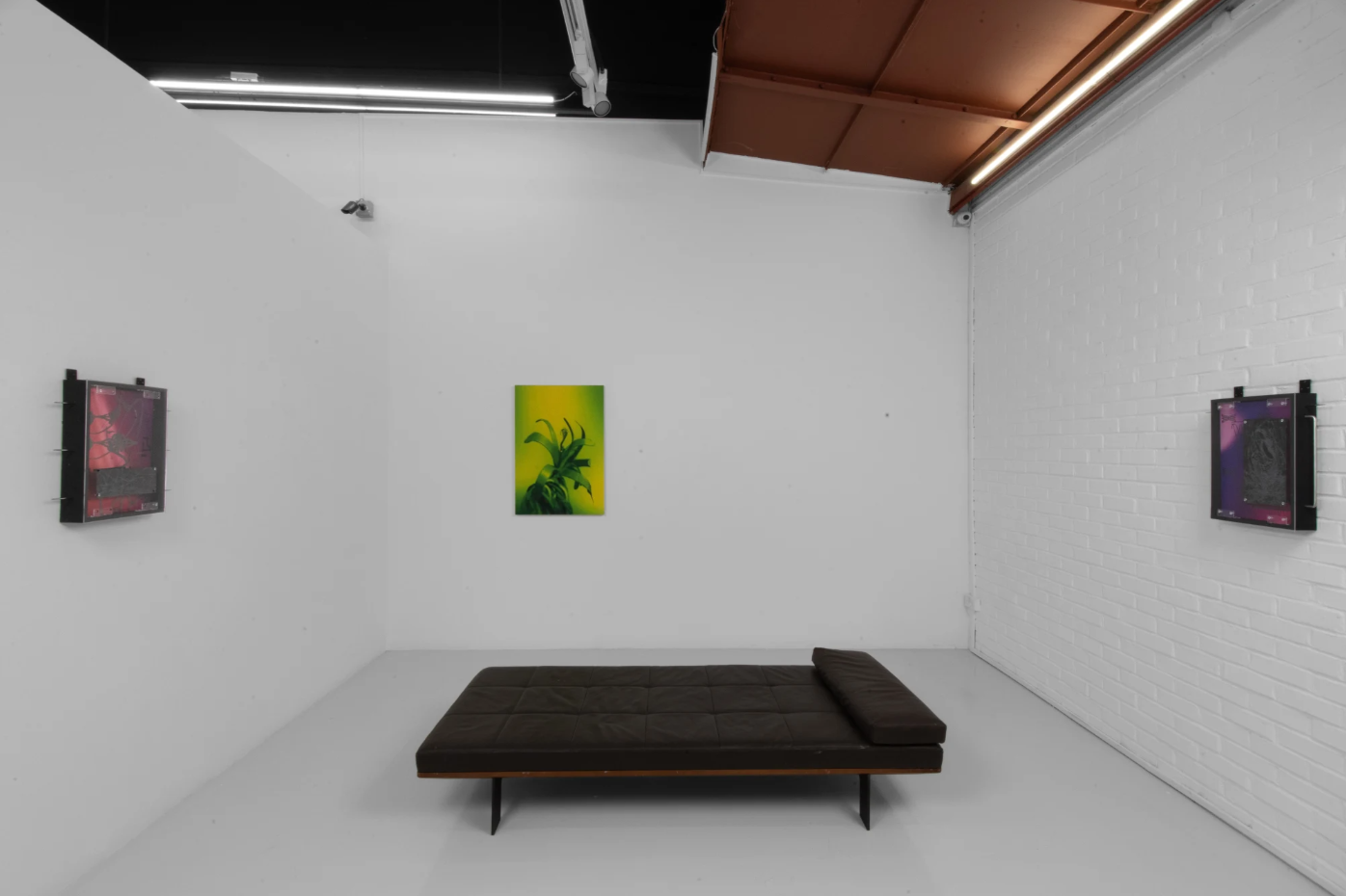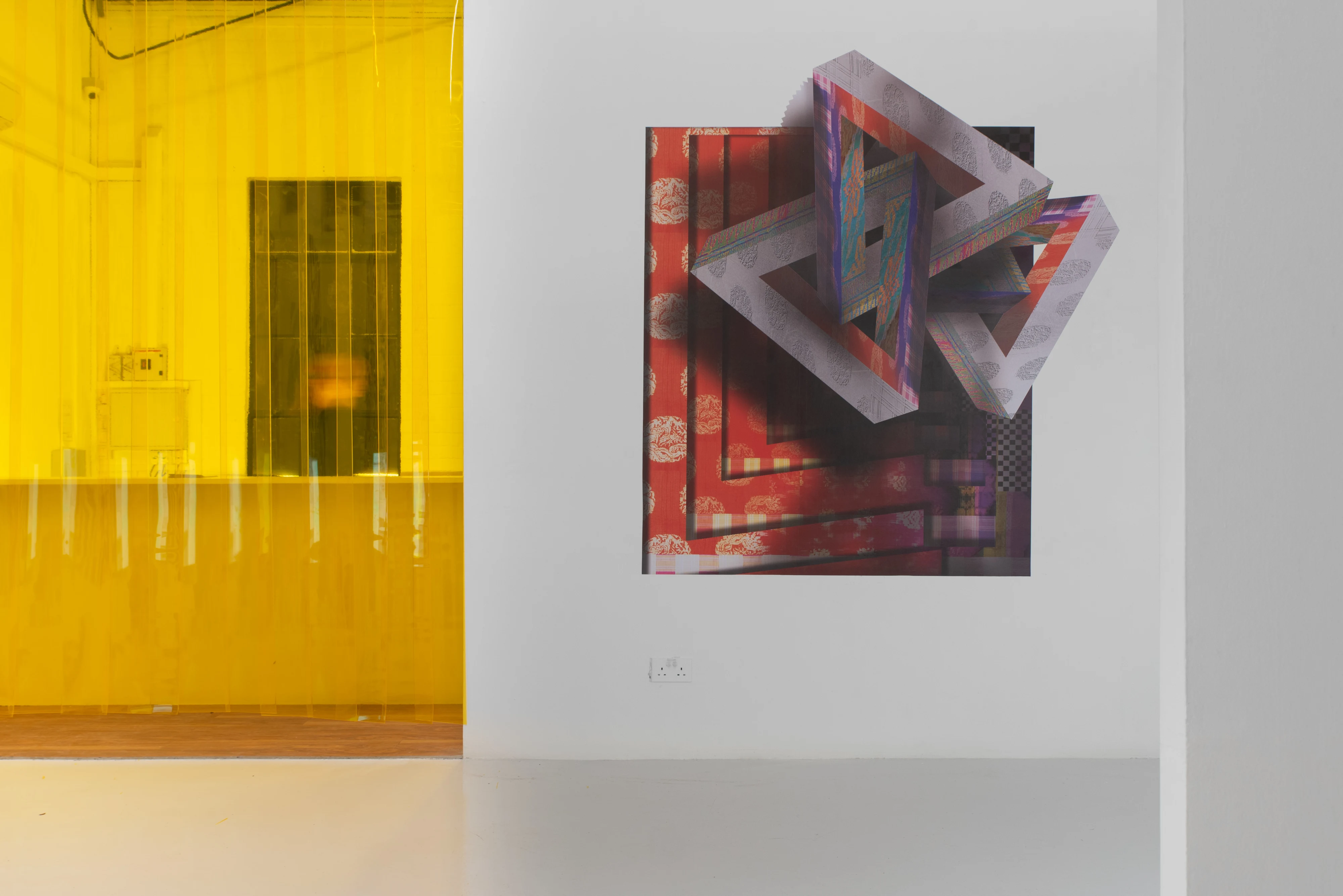 The presentation combines found industrial materials with stock photos—pre-existing, commercially available images—and generative images, which are created through algorithms or AI processes, seamlessly integrated with sonar vibrations. Creating vivid and geometric forms that threads into tropes of expiration, decay, and emergent materials. The works drift between technorganic landscapes, warping a sense of mythdrift—a transformation where traditional myths are reimagined as parafictions, blurring the line between lore, organic forms, handcrafted, and manufactured aesthetics. These narratives, like data in flux, are constantly rewoven with emergent technologies, creating new, ambiguous forms. Centered on a time-lapse of a plant undergoing cycles of deterioration and revitalization, permutations of sonar vibrations between a Nightjar—a bird native to Southeast Asia—and a sentient pantunist (or ancient programmer) are translated into objects oscillating between painting, sculpture, talismanic relief, printed circuit board, and map—each acting as a portal or gate, appearing to safeguard, sanctify, repel, frame, or decorate an interior.