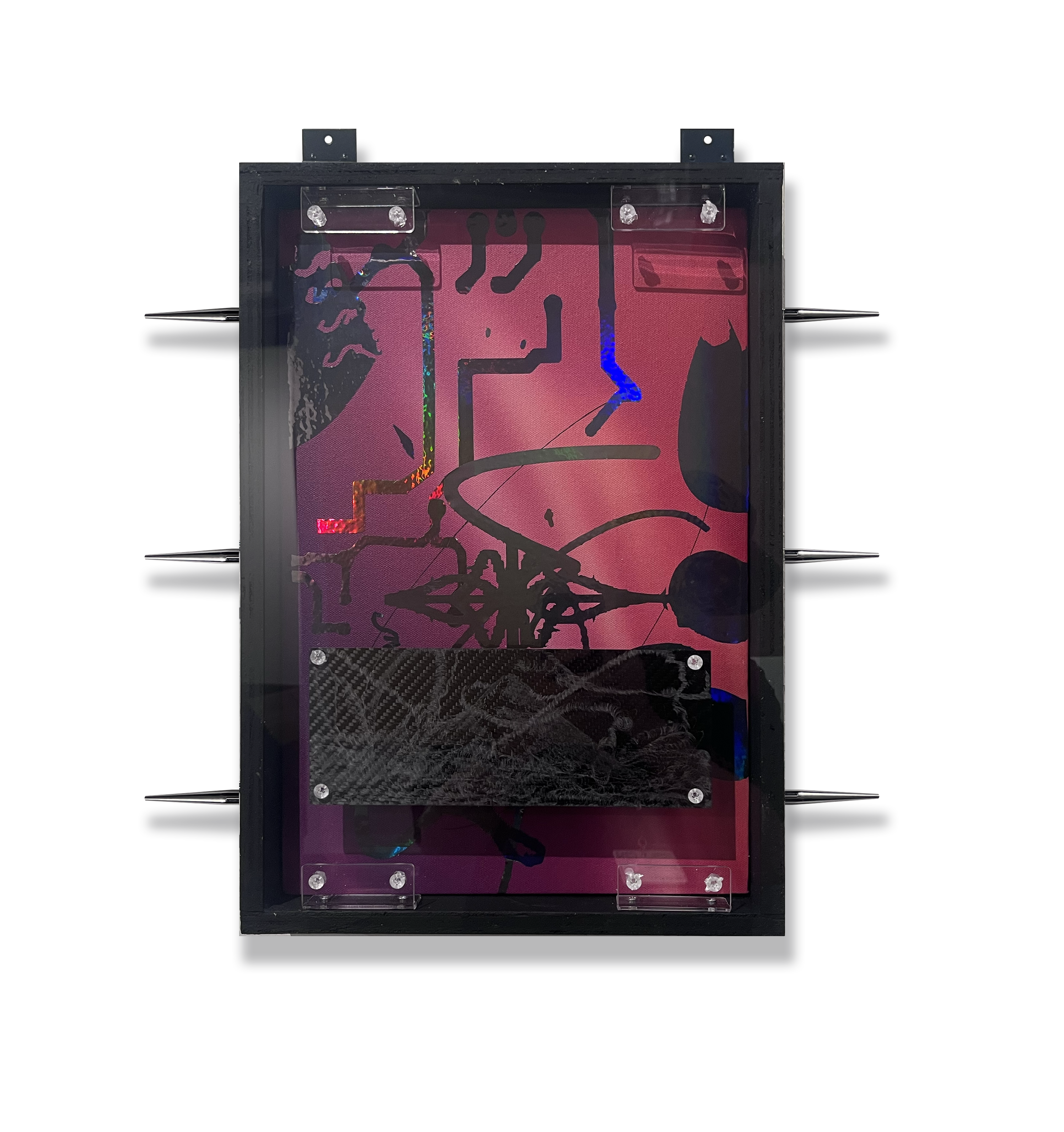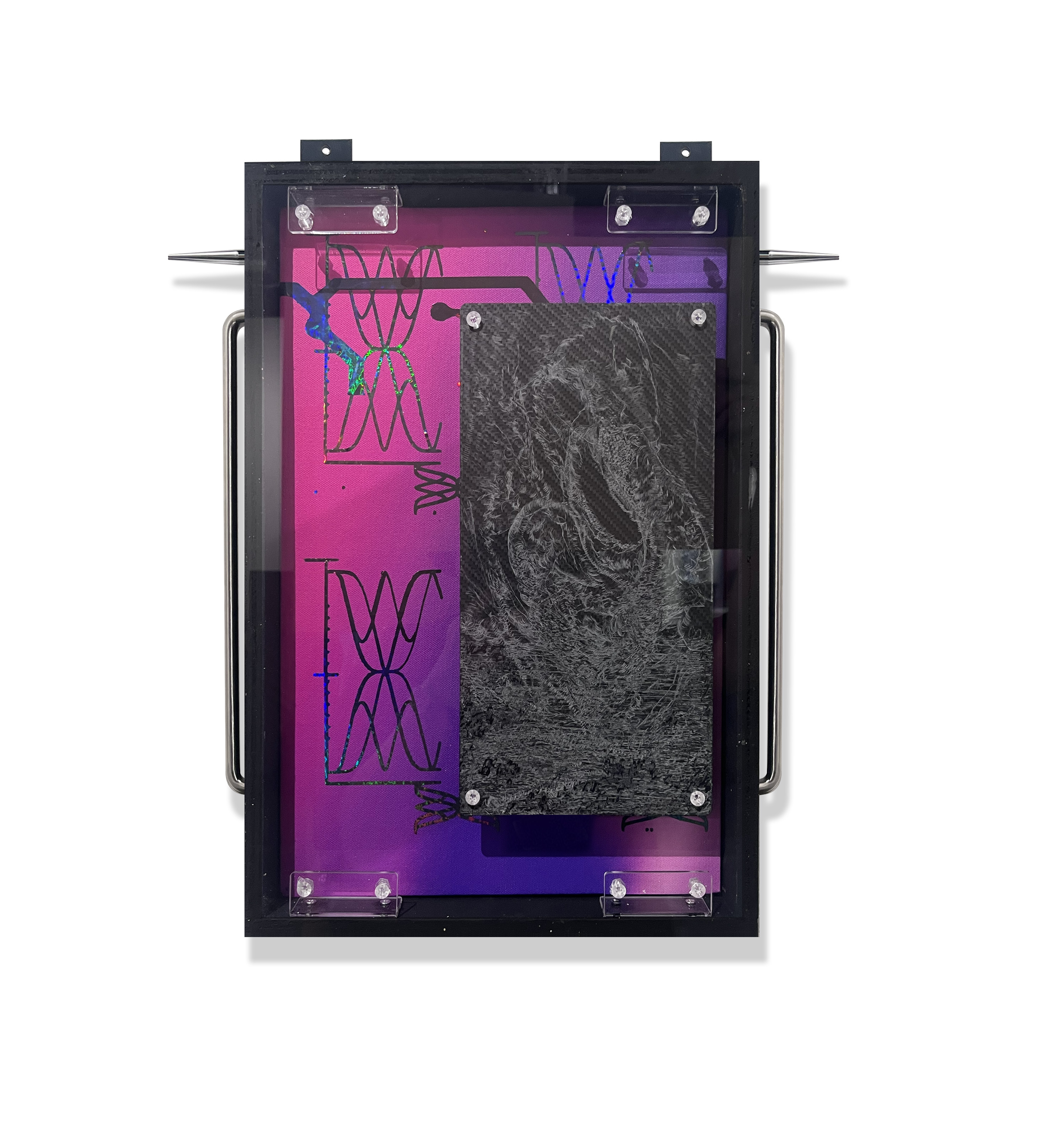 §, 2024Digital composites, acrylic, polyvinyl chloride on UV printed canvas, engraved carbon fibre, marine grade stainless steel, wood, 22 × 19 × 3.5 inches (Unique)